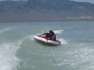 Every once in awhile we get to see some of our old friends in PG. The Porters was one of our favorite peoples' there. Ted and I used to watch their kids. It's amazing how fast their kids grew in just the 8 years we have known them. One in particular became my kids favorite babysitter. Lisa would come and watch my kids even after we moved away and living in Saratoga Springs. Lisa is now living in Herriman as a nanny. She still comes by to visit and last week when she came by she invited us to go boating. Of course we were more than excited to go and see the Porters again. We joined Valerie (mom), Luke, Lisa, Jason and his wife and little baby girl and also 2 of Lisa's friends. Ted and I had so much fun. The weather was slightly overcast when we left at 10. Once we got out on Utah Lake I decided I was not going in the water. The water was probably 50 degrees, and I still had a sweater on. By noon the sun was shining and it got very hot. But unfortunately the water didn't warm up as much as I would have liked. Keegan got tired around 1 and started asking to go home. His favorite spot was at the back so he could see all the action. We ended up leaving about 2 oclock because Keegan was really needing a nap and he didn't want to fall asleep on the boat. He did fall asleep in the car on the way home. Daesha did not want to leave the lake. She enjoyed it very much.